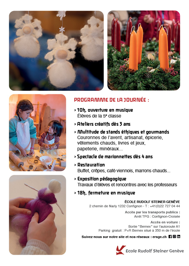 Artisanat, illuminations, décorations, animations, restauration, ateliers pour les enfants animés par les grands élèves… Le marché de Noël de l’école Rudolf Steiner est l’endroit idéal pour préparer vos cadeaux de Noël, flâner en toute convivialité ou simplement se faire plaisir.